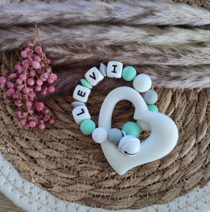 - Silikongreifling Standard enthält: Silikonkugeln 15 mm, Silikonkugeln 12 mm, eine Silikonmotivperle (Stern, Herz oder Sechseck) und einen Beißanhänger